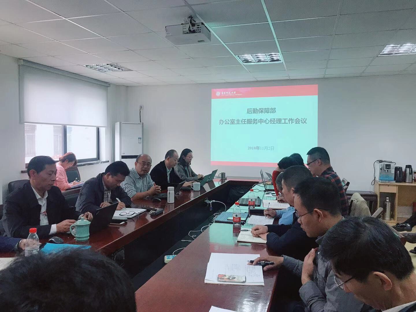 2018年11月2日上午,后勤保障部在中北校区后勤楼206会议室召开办公室主任和服务中心经理工作会议。会议由后勤保障部部长赵健主持,后勤保障部党政领导、各办公室负责人、各服务中心及部分社会企业负责人出席了本次会议。