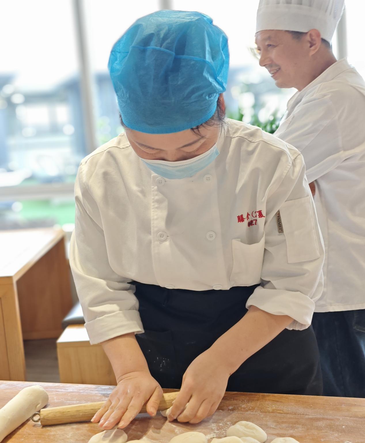 白案赛区内虽无灶火热烈,却也紧张激烈。选手们揉捏擀切制作点心。按照比赛作品规定,参赛选手制作的每个包子不少于十六个褶,且需均匀美观、馅料饱满,非常考验师傅的日常功底。创意环节,融合西点工艺的栗子塔、肉松酥等作品,赢得现场参评人员的连连称赞。