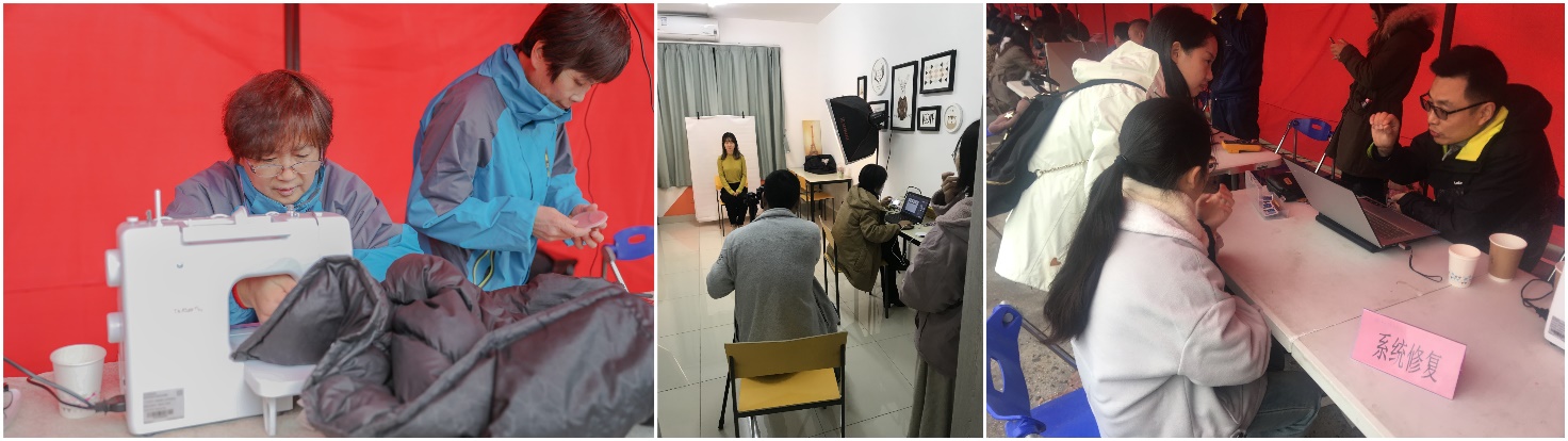 两校区宿舍与教学楼服务中心带来了免费缝补衣物、免费拍摄证件照、免费电脑修复三项免费服务,当天为师生免费缝补衣服 54件、拍摄证件照62人、电脑系统维修及网络使用咨询6人。