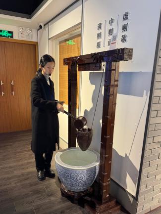 “虚则欹,中则正,满则覆”讲解员指向展出的欹器模型,“它警示我们党员干部若内心空虚便会迷失方向,唯有坚守初心、品行端正方能行稳致远,而私欲满溢则必然走向倾覆。”这一跨越千年的廉政隐喻,引发大家对后勤服务工作的深思与共鸣,后勤工作管的是师生‘柴米油盐’,更要学欹器守好‘中道’,不存私心、不越底线。