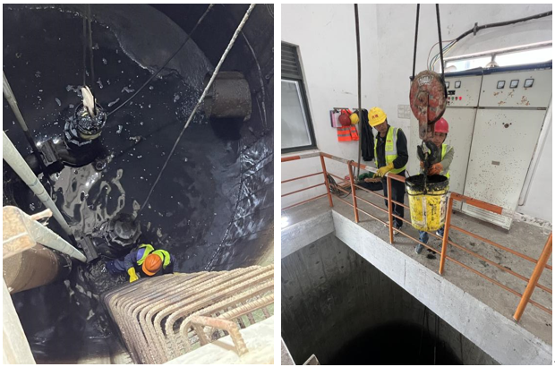 检修过程中,工作人员严格按照安全操作规范,对集水井水泵进行全方位排查检测,精准排查出排水泵启动时存在的漏水隐患,并第一时间开展维修、更换作业,确保设备运行达标。为进一步提升排水效率,保障汛期排水通畅,检修团队同步对集水井内淤积淤泥进行彻底清理,对排水井进行全面冲洗,清除管道内杂物堵塞,全方位优化排水系统性能。