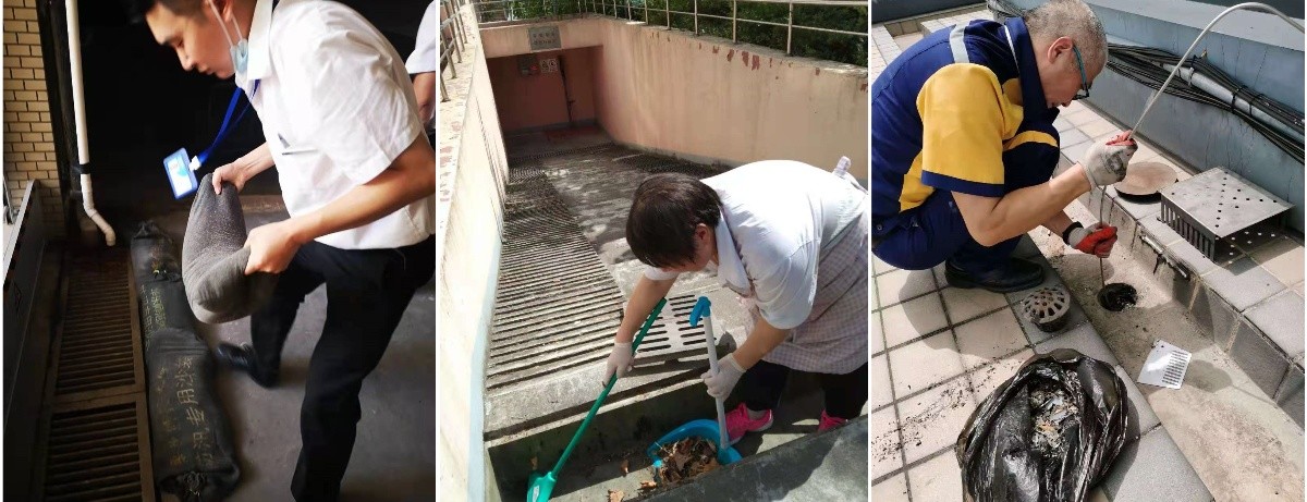 后勤人全力抗击台风“烟花”——物业部门提前摆放沙袋、清理排水沟