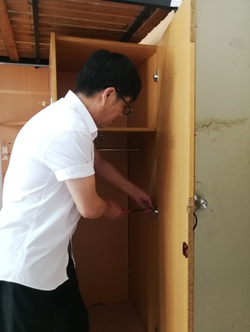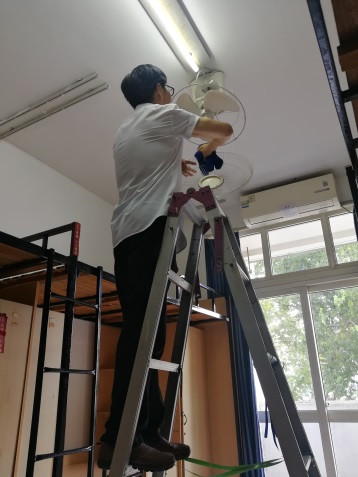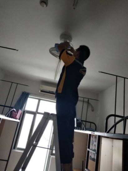 宿舍工作人员进行了破损家具维修、窗帘清洁更换、风扇清洗、开水箱保养、墙面粉刷维护等系列工作。