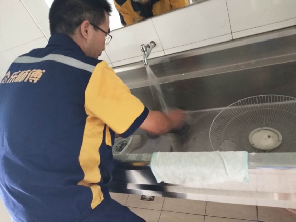 工作人员清洗风扇罩 工作人员清洗公共区域灯罩
