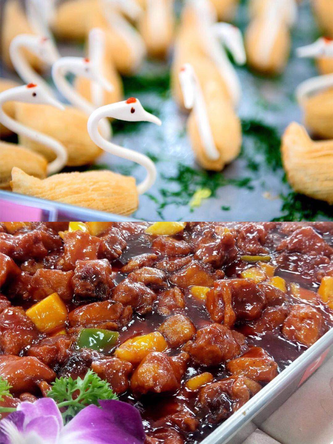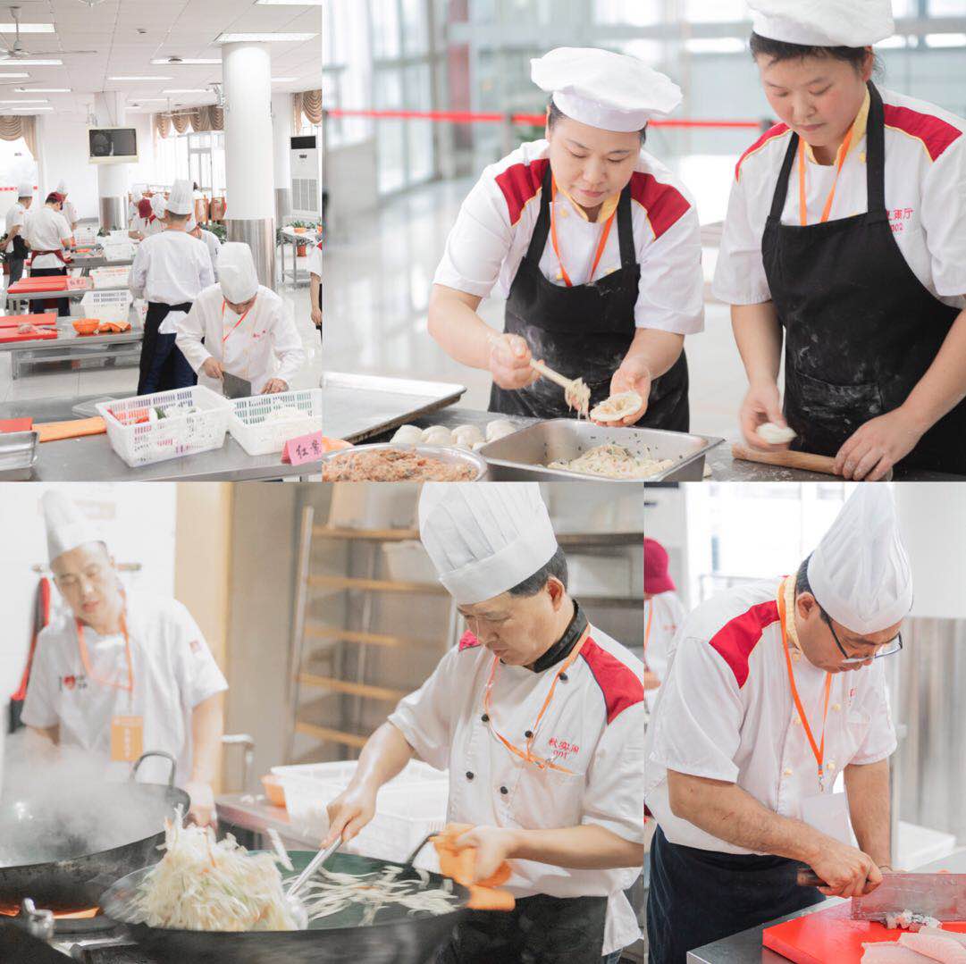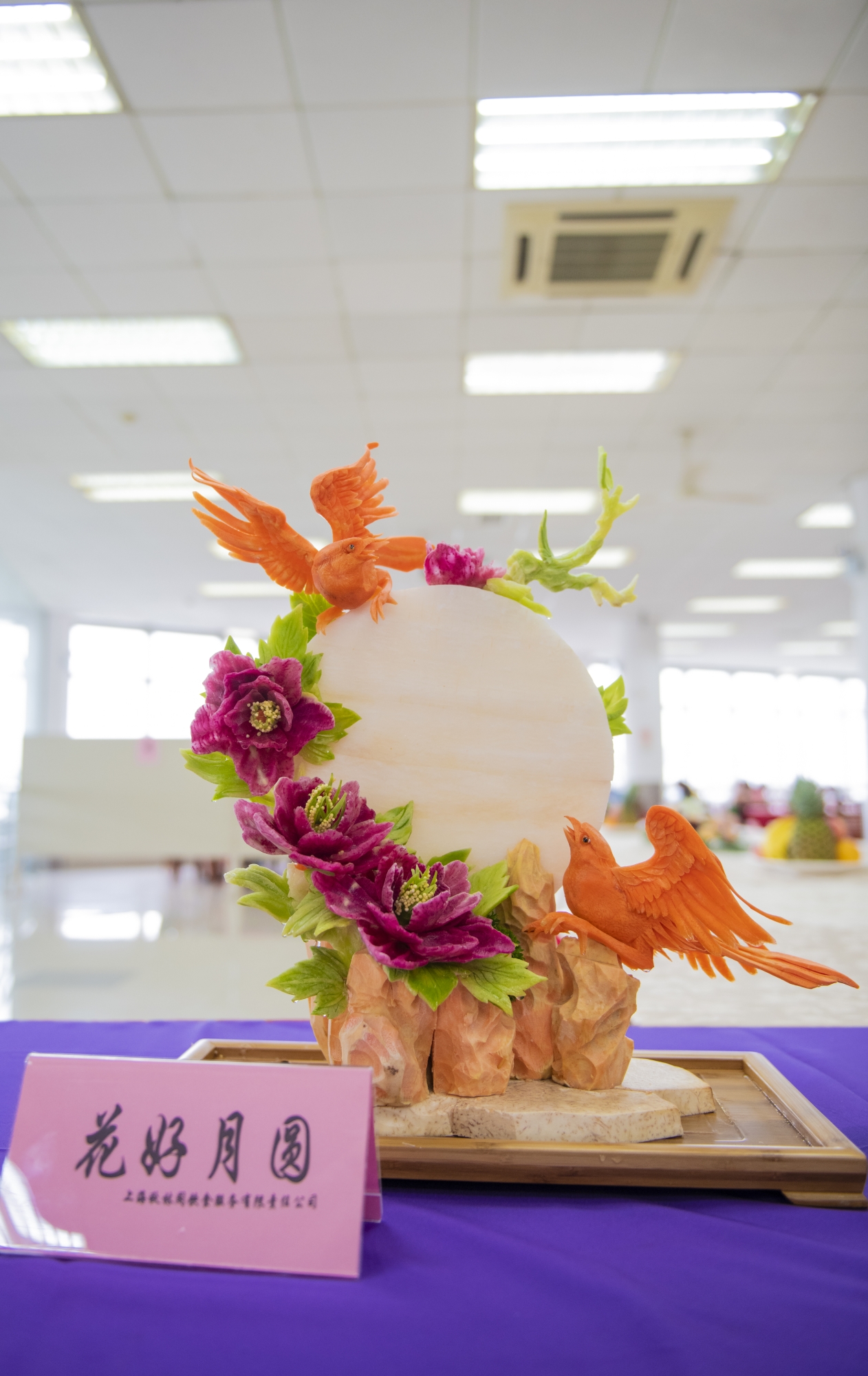 膳食服务中心(1)、膳食服务中心(2)、上海中快餐饮管理有限公司、上海秋林阁饮食服务有限责任公司、上海象郡餐饮管理有限公司等5家校内餐饮服务单位代表队23名选手参加了比赛,参赛作品共有15道红案、15道白案、5个食品雕刻作品。根据比赛规程,各代表队要在90分钟规定时间内完成6道菜(红案和白案各三道)的操作,参赛选手从每道菜的切配、上灶烹饪到出品等工序都要求独立完成,在刀功、调味、色泽、口感、营养等方面考量选手的厨艺技能水平。各参赛选手精神饱满,胸有成竹,厨艺程序有条不紊,动作娴熟,各显其能,充分发挥了自己的精湛厨艺。