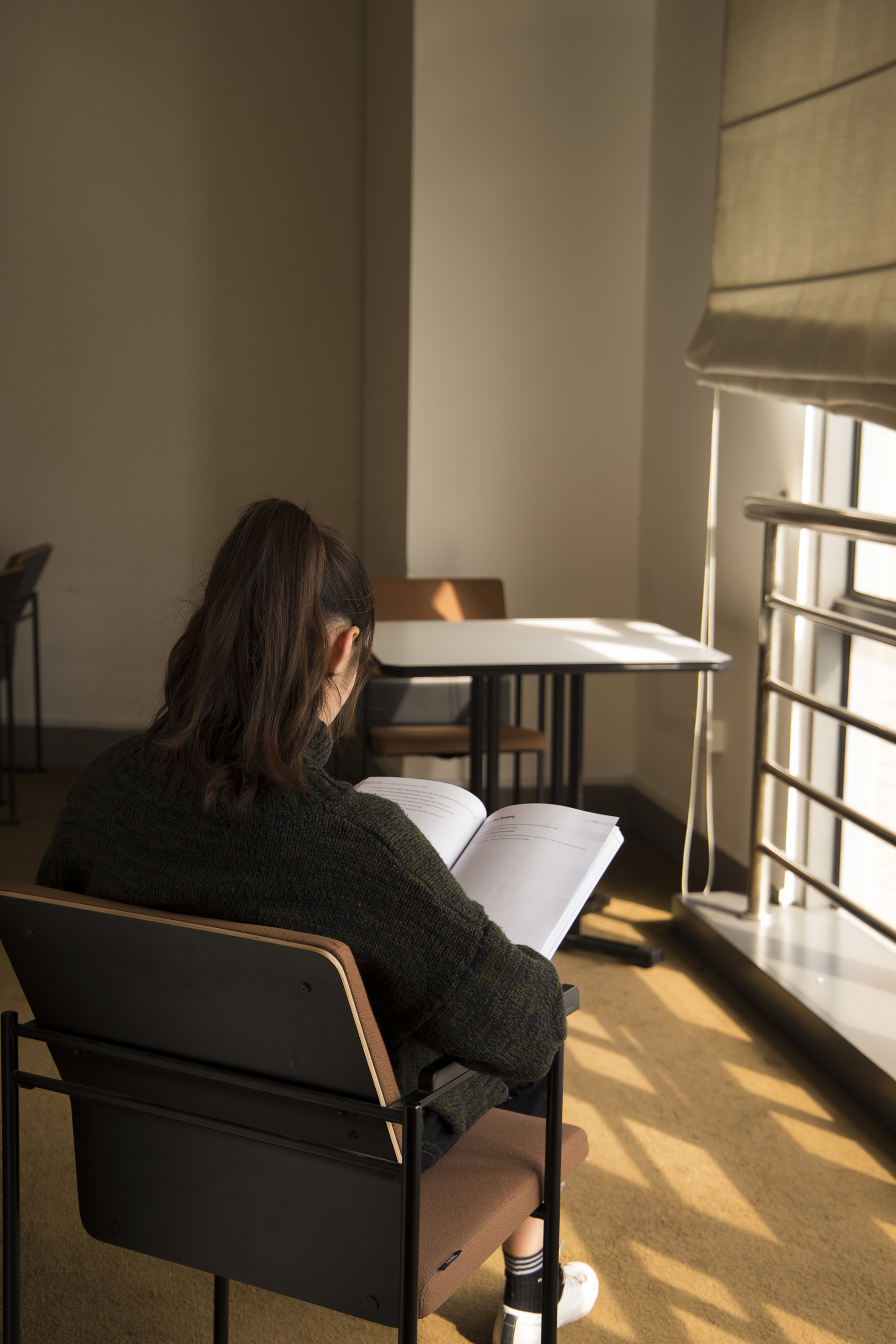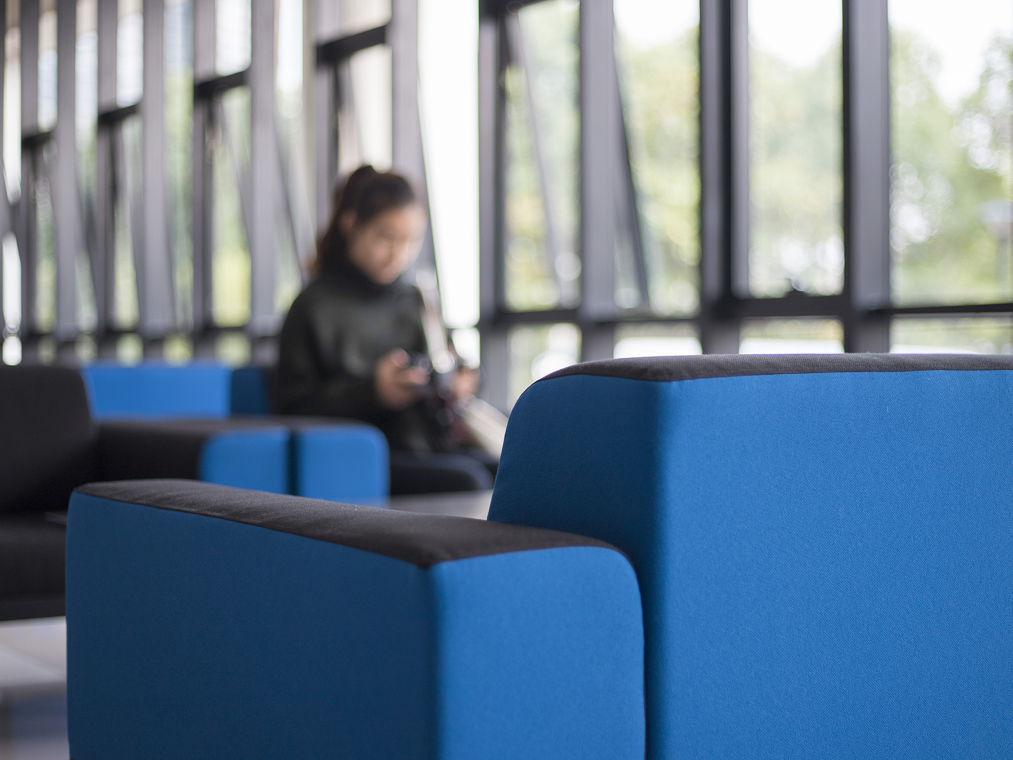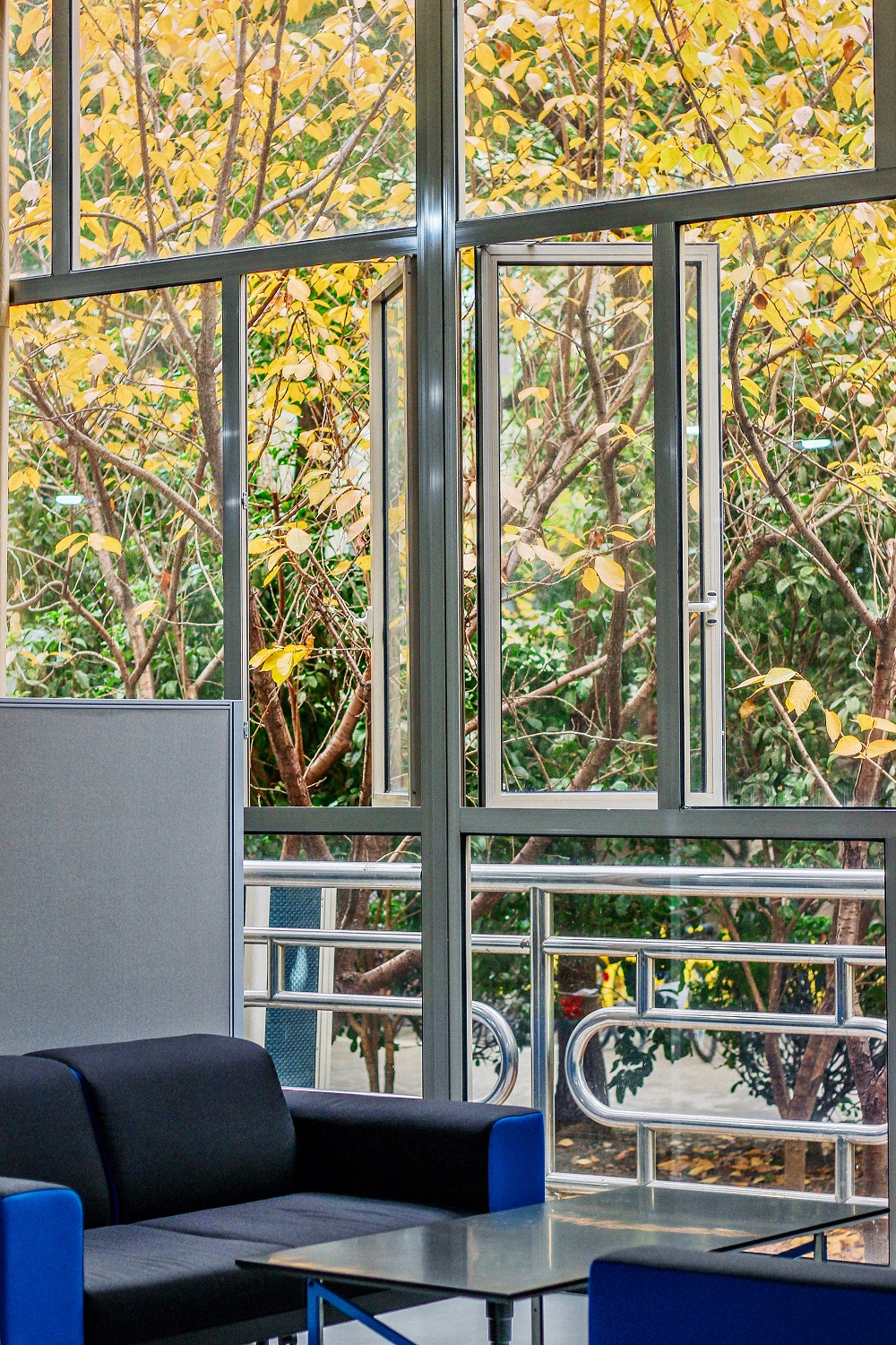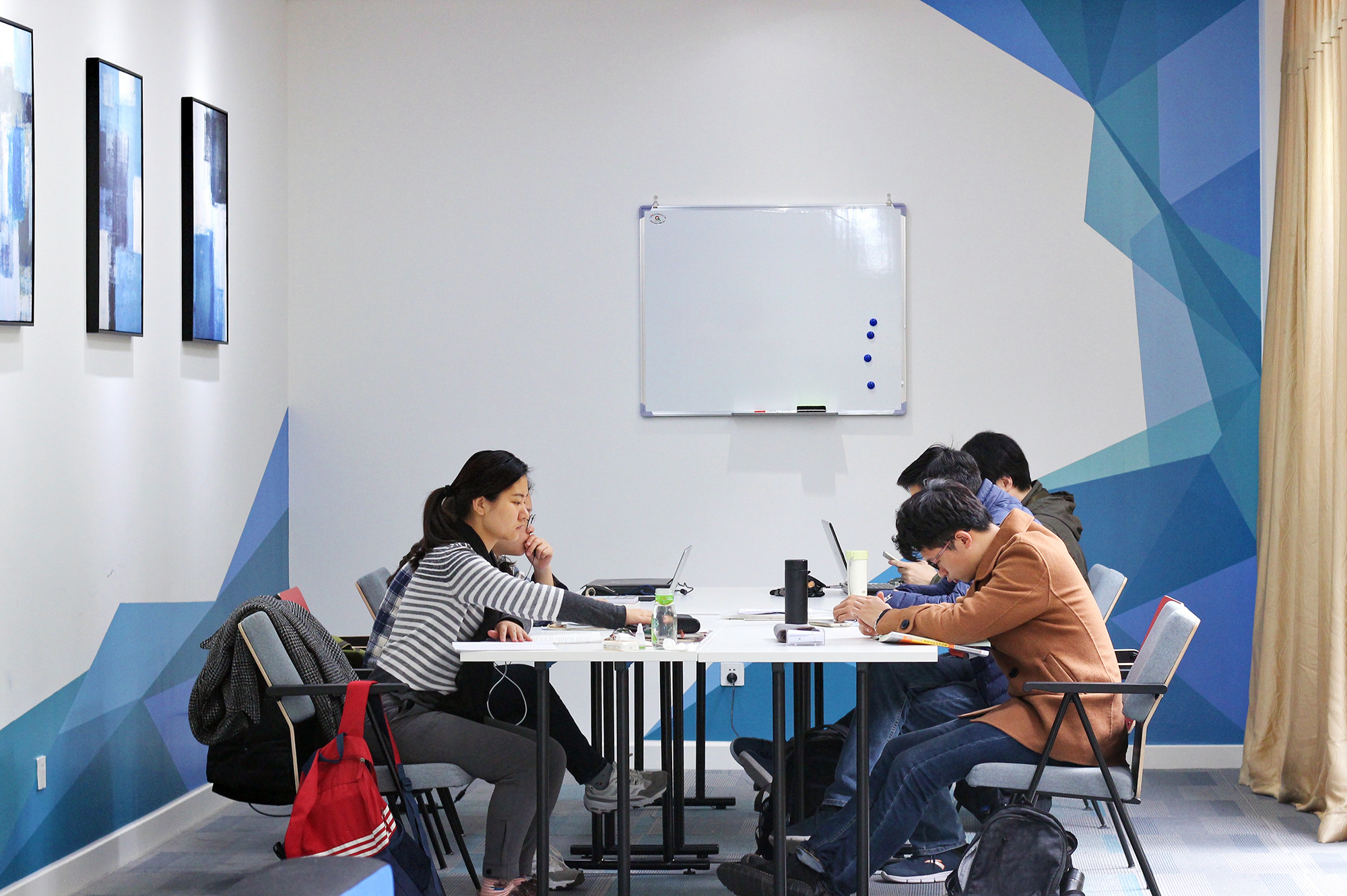 改造后的田家炳楼117-119自习室,低明度冷色系配原木色营造安静的学习环境