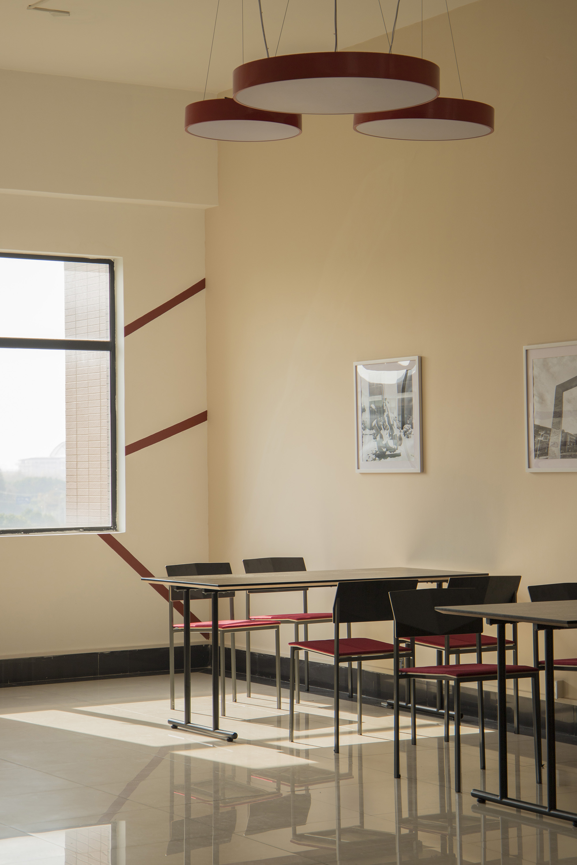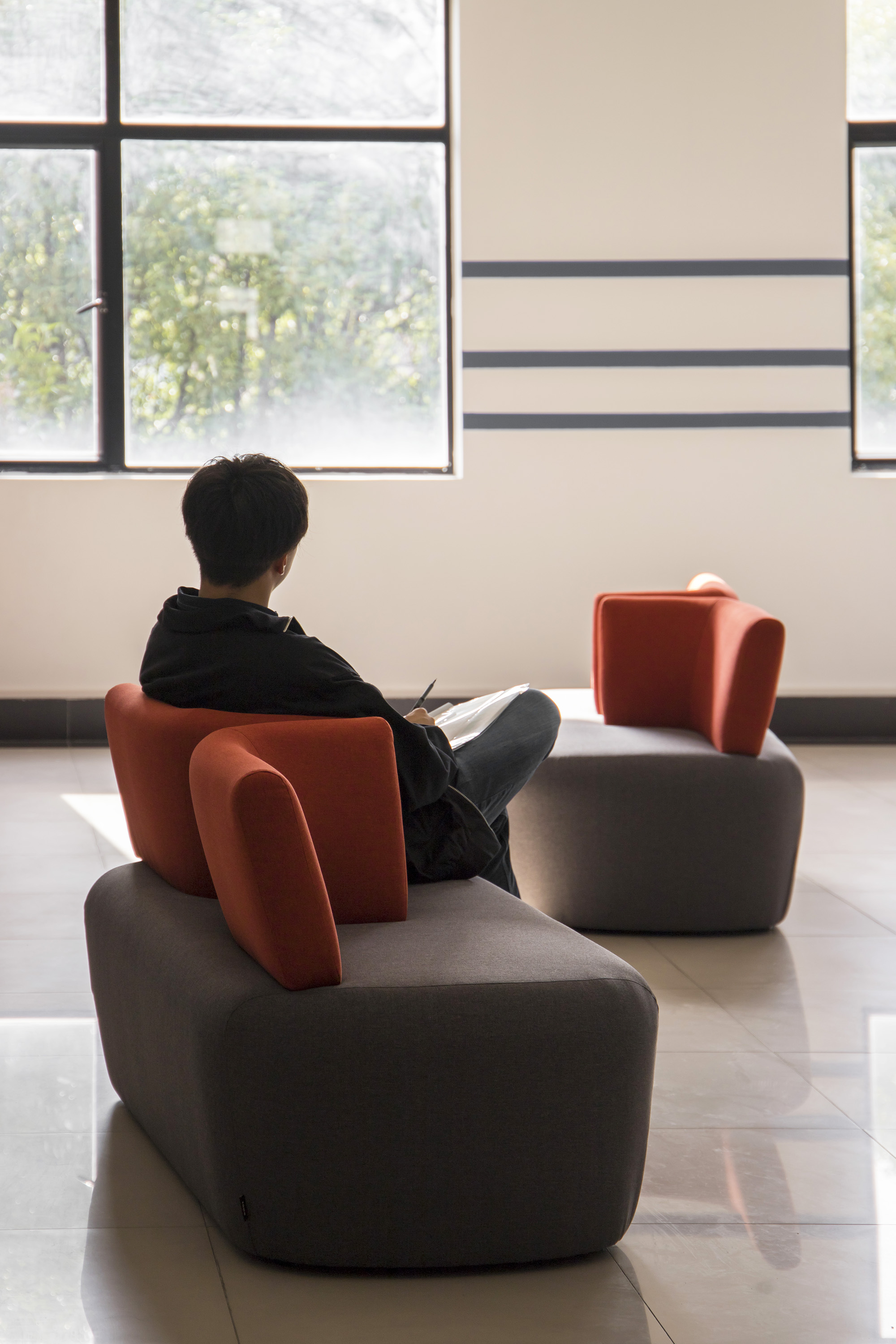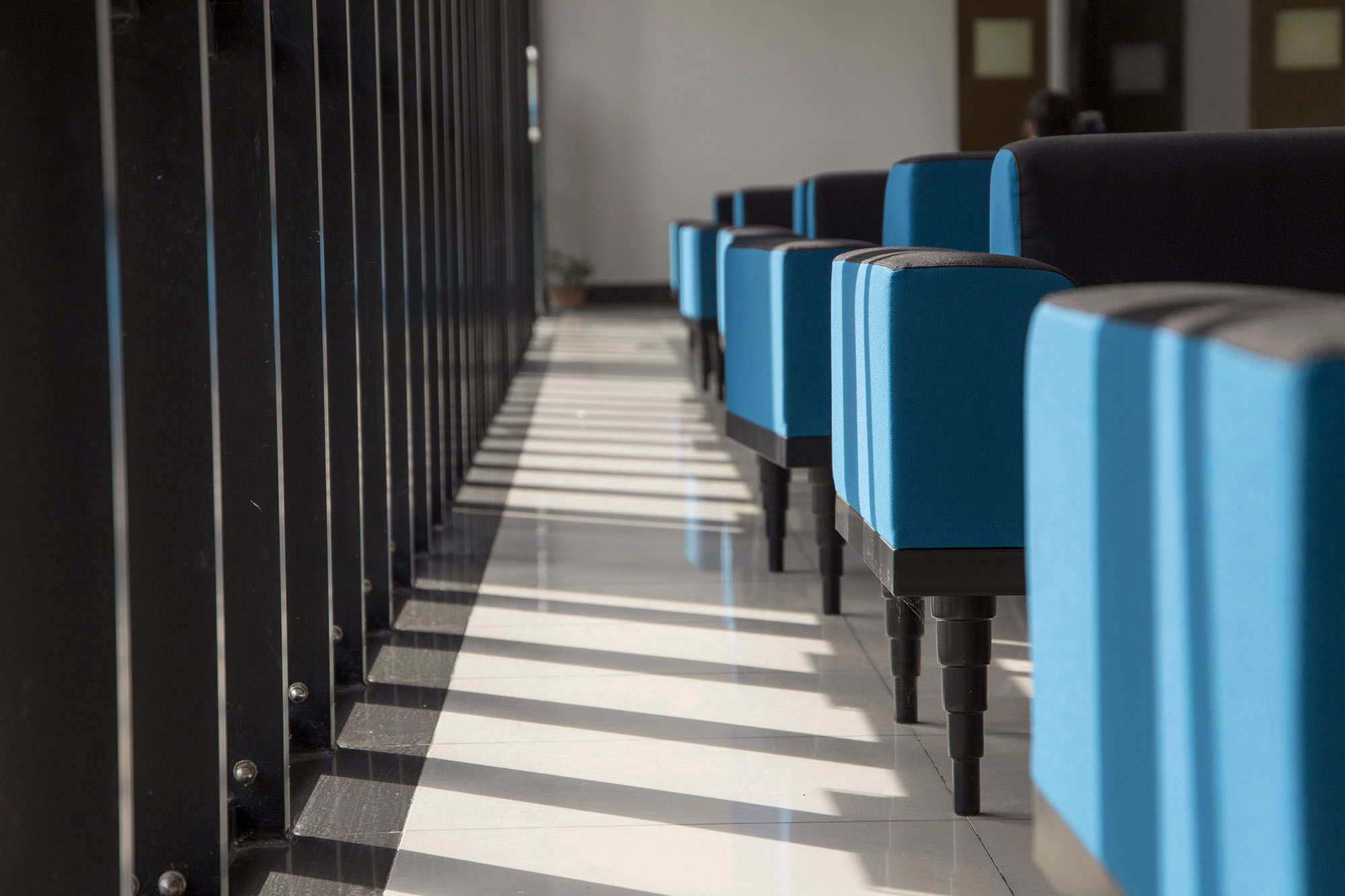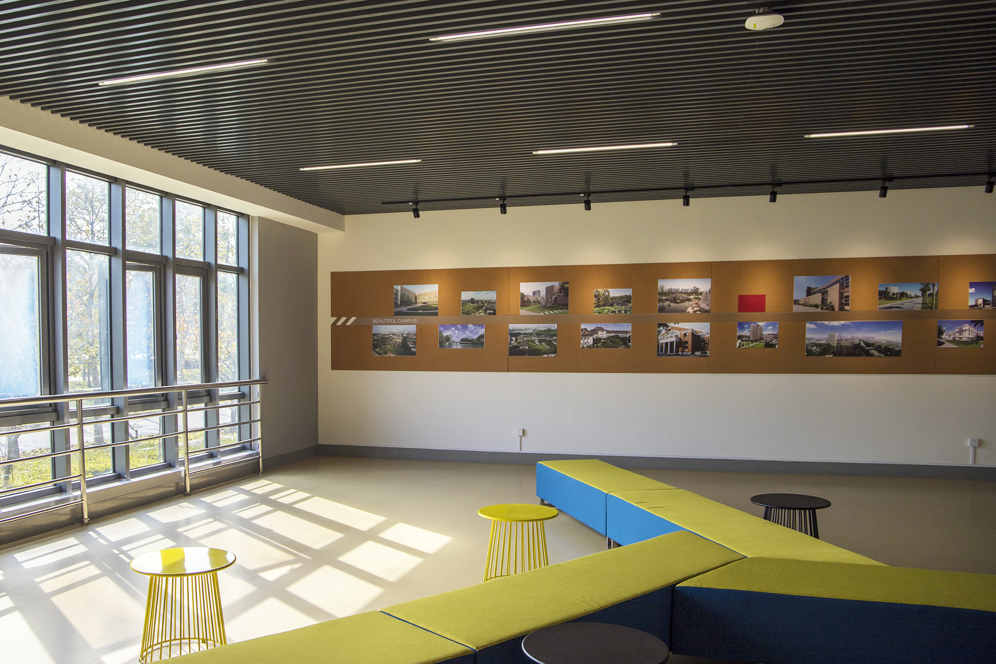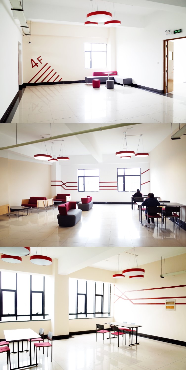 对开敞区域的功能再造,让闲置的外廊空间有效而积极。之前一直闲置的一教二、三层过厅被改造为休息厅,布置了简洁的现代家具,方便同学们学习交流。每个层面都具有统一的设计风格,从家具到地板、墙面乃至灯光,都具有和谐统一的配色,十分讲究。此外,一教二层门厅、二教主门厅入口玻璃窗处也放置了休息桌椅,为师生提供舒适优雅的课间休息空间。