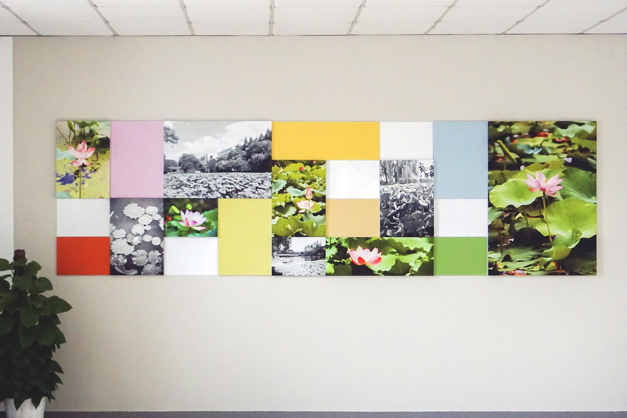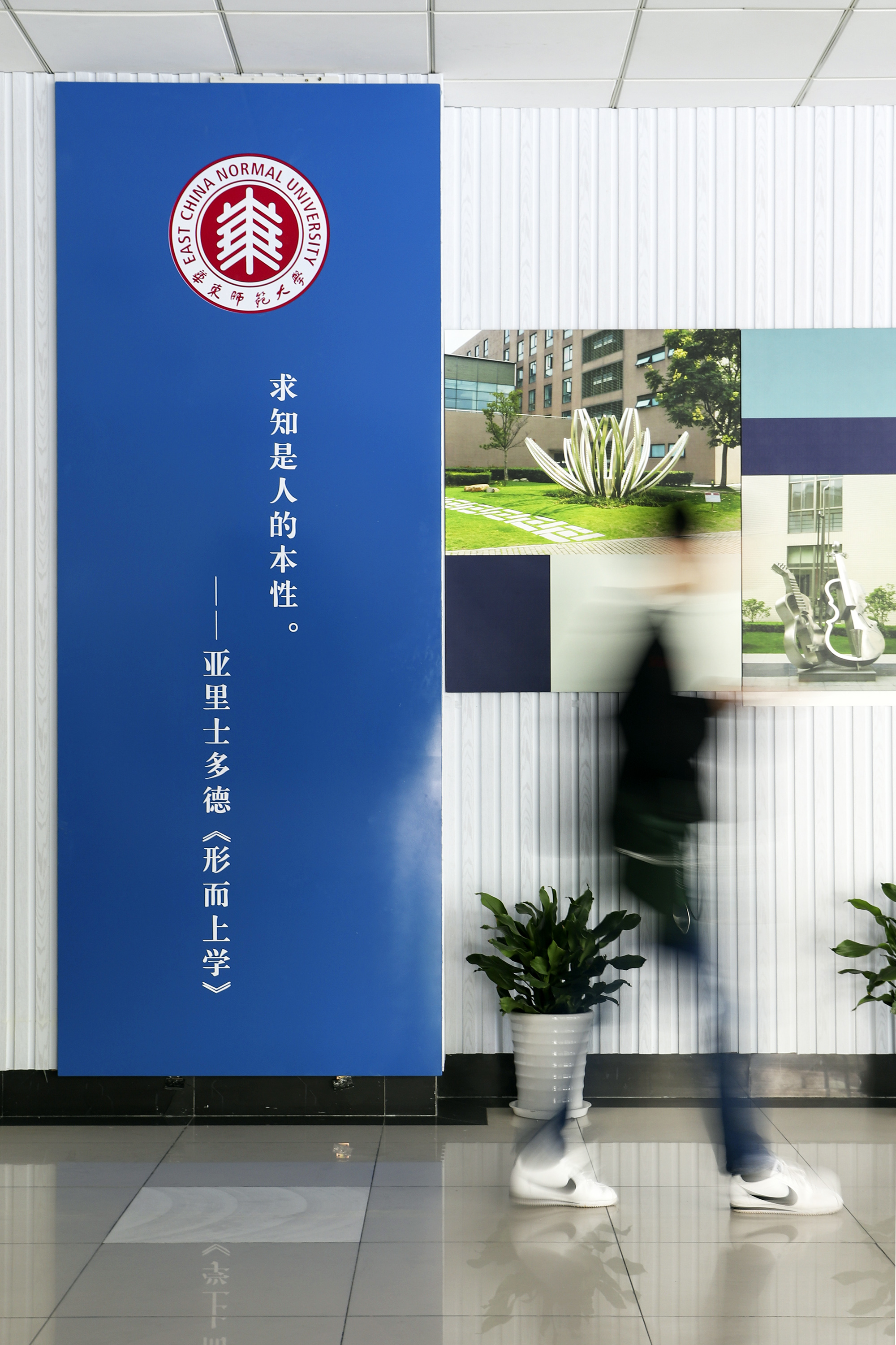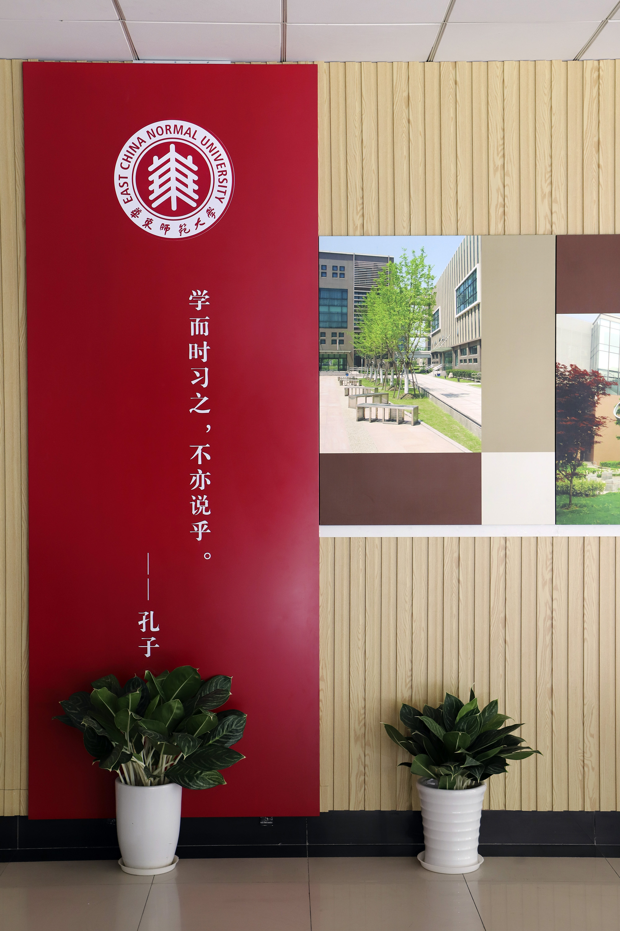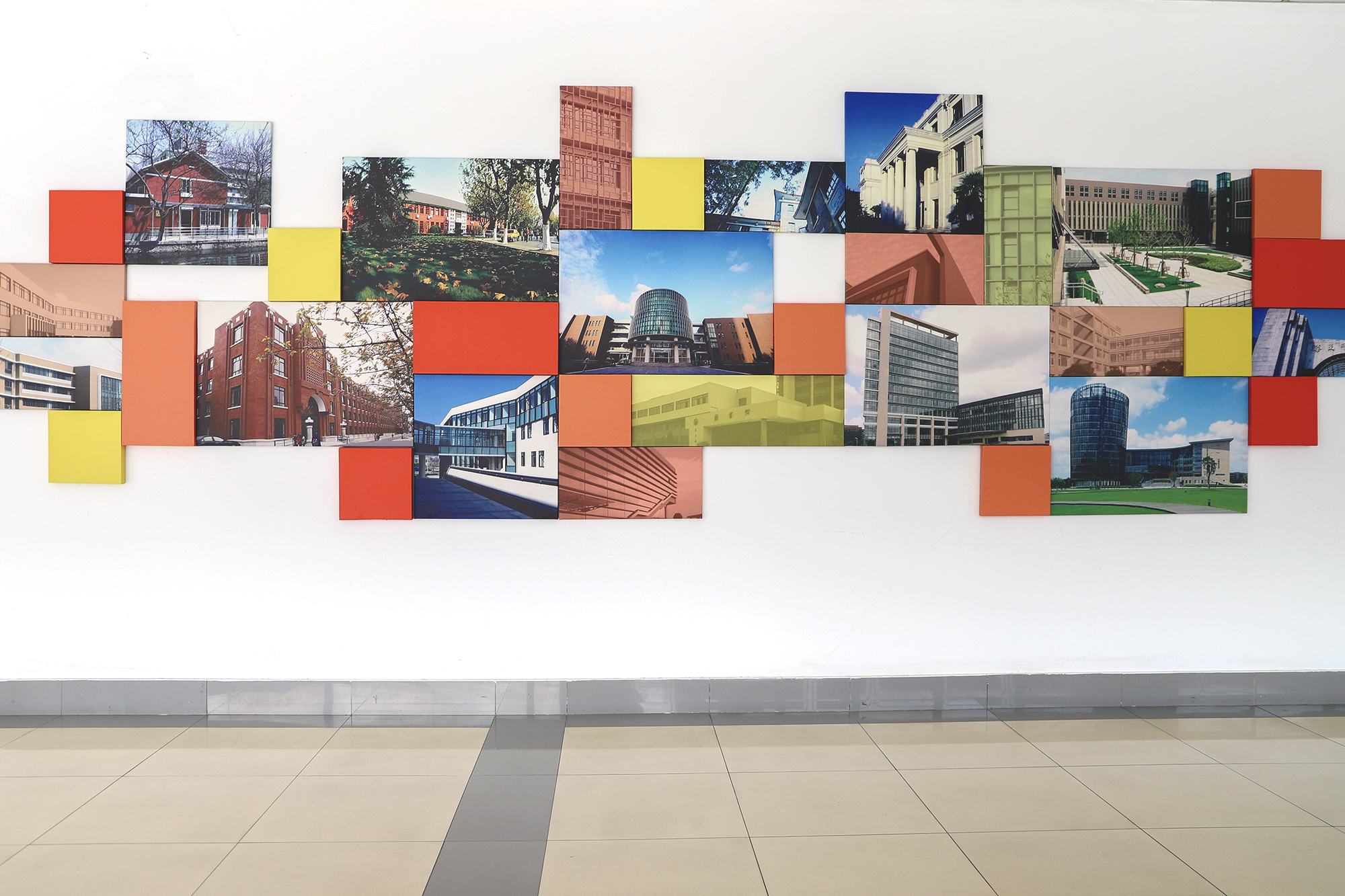 对墙面环境的设计利用,让单调的外廊空间生动起来。一教门厅每一层都精心设计了壁饰,一层是以华师大校花“荷花”为主题的摄影作品,二、三层主墙面分别布置了闵行校区和中山北路校区的校园风景照片;过厅墙面以“师大梦”为主题,通过“华师大优秀建筑的历史照片”和“华师大校园风景照片”展示师大校史,品味美丽校园的历史底蕴。二教主门厅用新老校区的建筑照片拼汇成色彩鲜艳的“校园建筑缩影”装饰墙面,次门厅旁采用了中国美术家协会王大有设计的姓氏图腾作为墙面装饰。在教师休息室里也布置了国画、油画、丙烯画等美术作品,为教师营造了一个宽松又有艺术氛围的交流与休息空间。