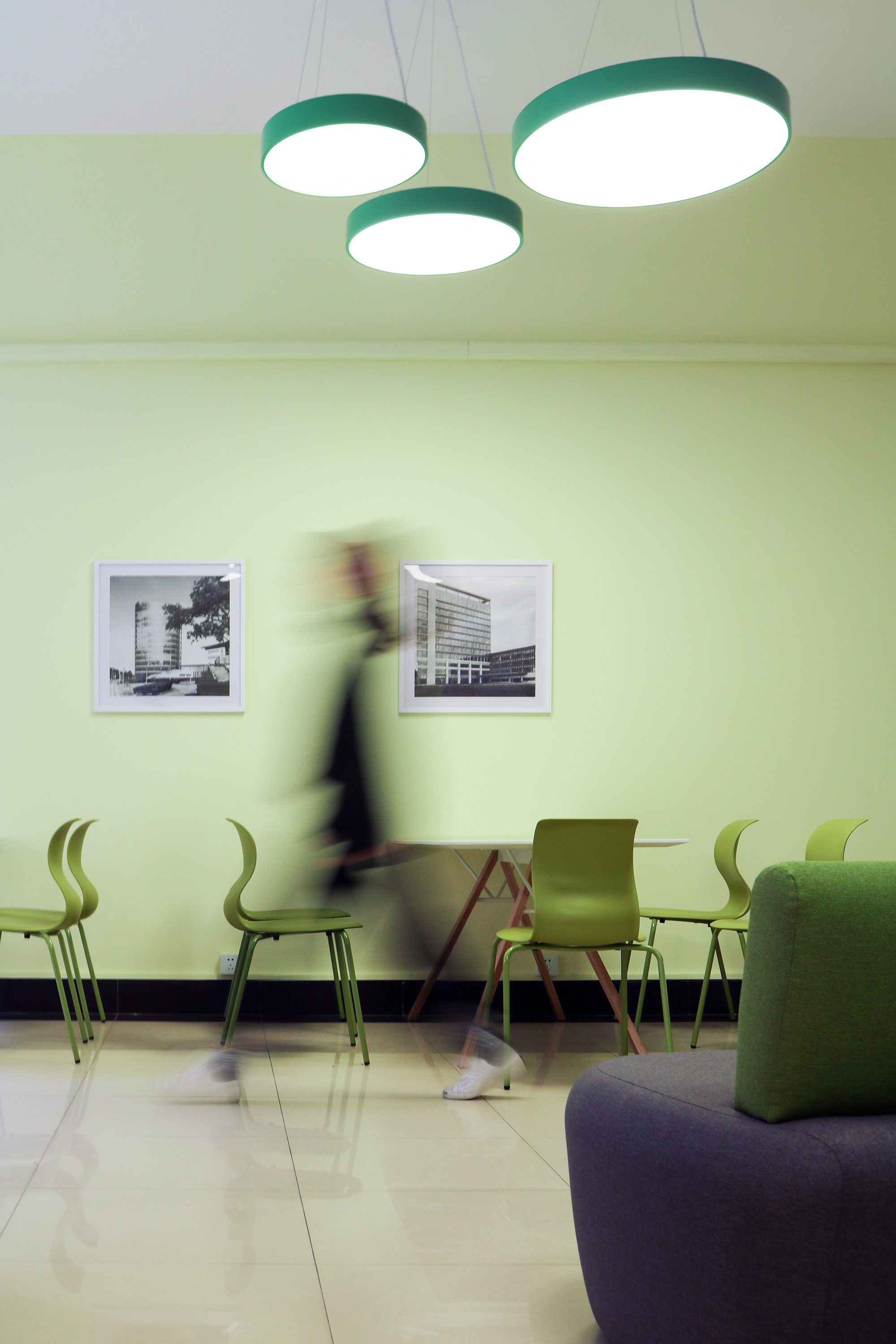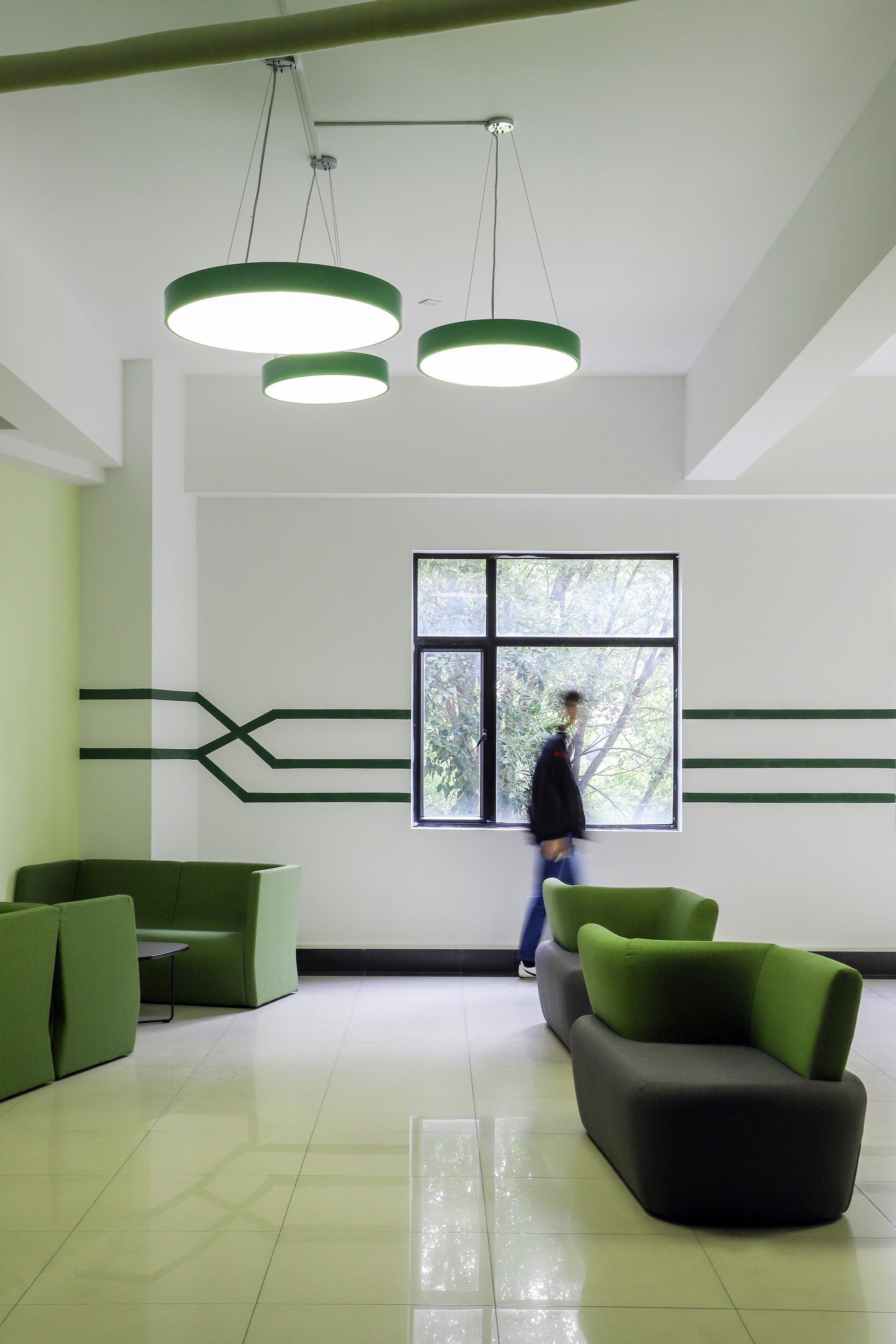 第二教学楼,邻近色相的配色营造出柔和的氛围