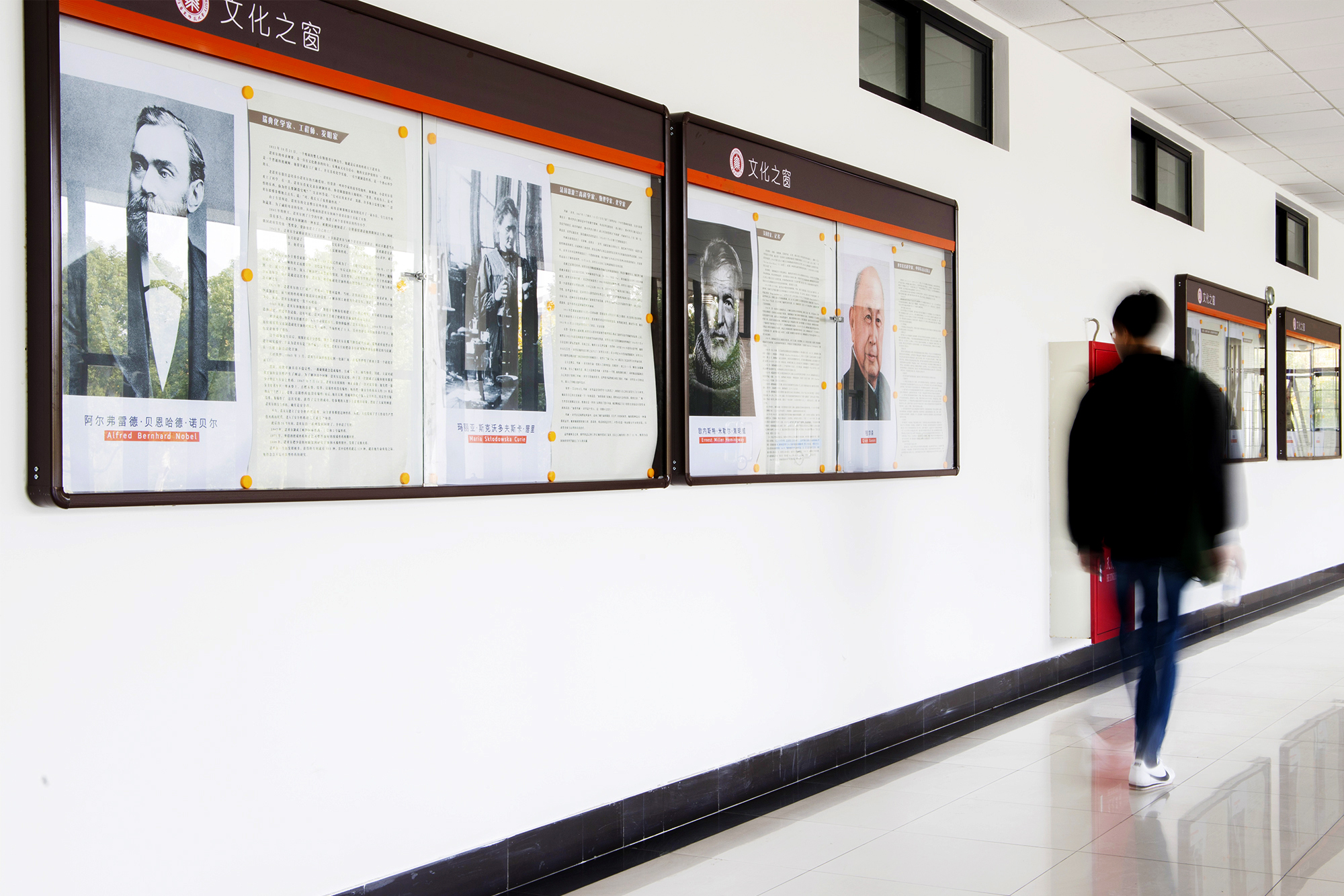 第三、第四教学楼的一楼过道里,原本空荡的落地窗边增设了一系列舒适的沙发座椅,充分利用优越的自然光线条件和室外绿化带风景,为师生打造出别具一格的课间交流、休息场所。而座椅对面的墙面上都设有校园文化宣传栏,将不定期更换主题和内容。后勤保障部将与学校其他部门通力合作,确保文化宣传内容准确无误。教师休息室都新增了电波钟、造型书架等设施。