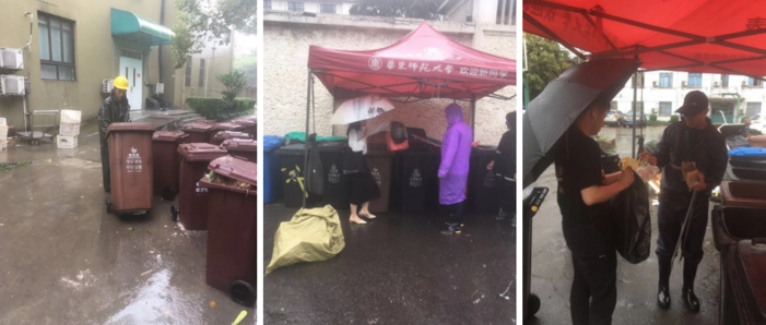 暴雨中,员工坚守在垃圾临时投放点,引导师生正确分类